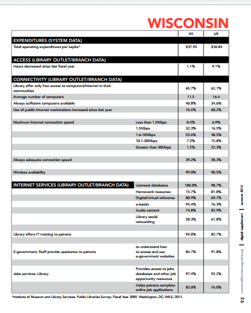 - Below the average number of computers, which, I assume, is primarily due to the fact that more than half of Wisconsin's public libraries are located in communities of less than 2,500 population. According to the 2009 Public Libraries in the United States, published by the Institute of Museum and Library Services, the average number of public-use Internet computers in U.S. libraries per 5,000 population is 3.9. Wisconsin's average is 4.3.